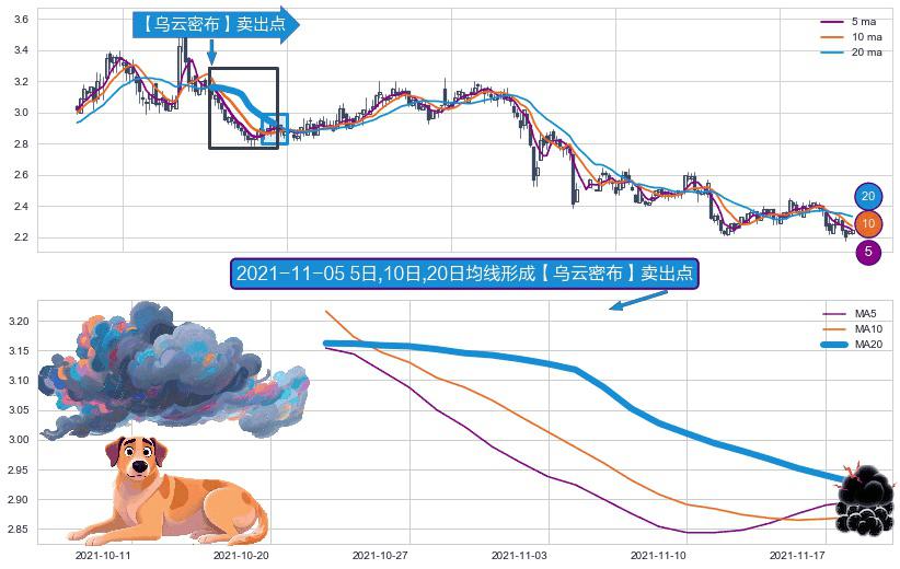 形态多维评估: ⚀ 2021-10-22日-2021-11-18日显现 5日-10日-20日均线 【乌云密布】卖出点 看空信号,后市看跌,卖出
