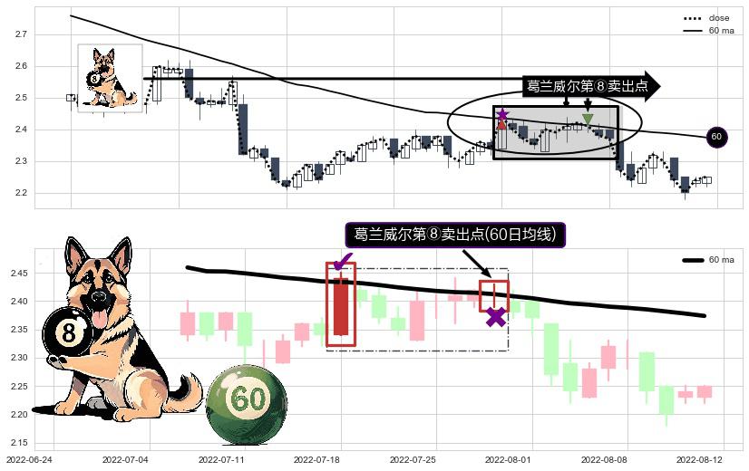 形态多维评估: ⚀ 2022-07-28-日显现 葛兰威尔均线 60日均线 第⑧卖出点 下降趋势的中继信号,后市看跌,卖出信号