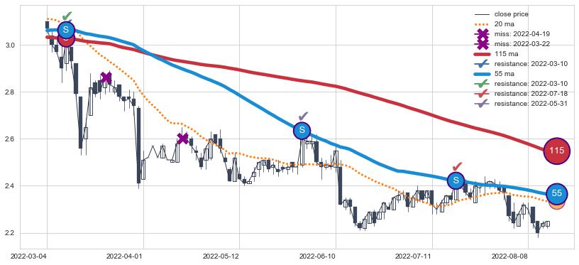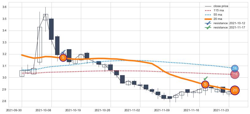下跌趋势2022-03-04-2022-08-12,均线115, 55确认关键阻力3处