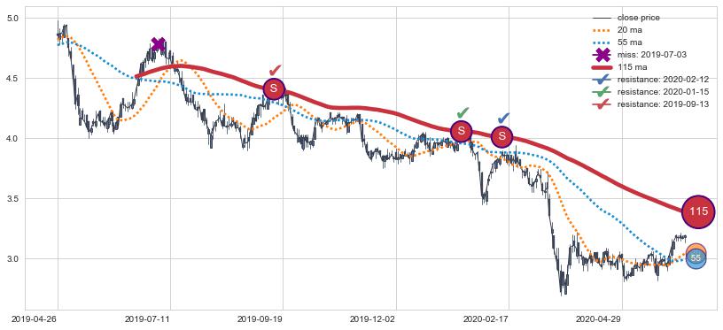 下跌趋势2019-04-26-2020-06-10,均线115确认关键阻力3处