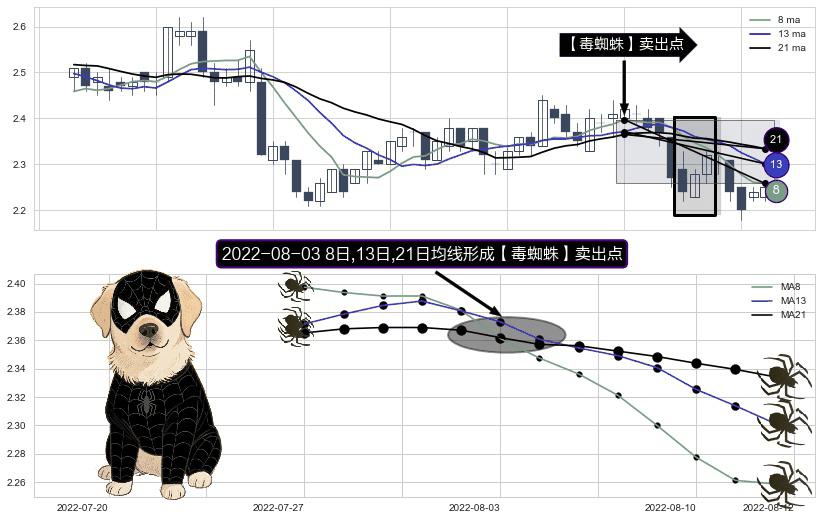 形态多维评估: ⚀ 2022-08-03日显现 8日-13日-21日均线 【毒蜘蛛】卖出点 看空信号,后市看跌,卖出
