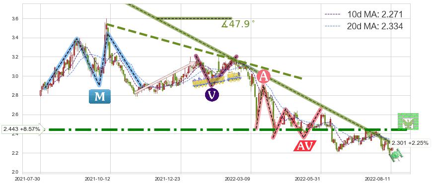 🦴 长线均值回复组合短线趋势跟踪[强阻力信号]2021-10-07-2022-08-12下跌趋势依然成立(下跌趋势跟踪依然存在),短线价格略微上行反弹(均值回复猜想),即将接近下跌趋势提供的未破位阻力价格:2.301。