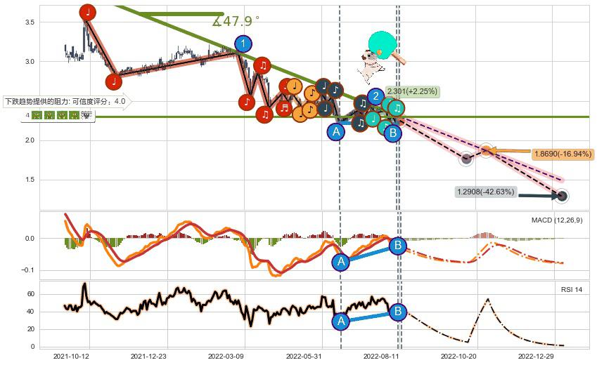 ♘ 在最后的下跌阶段2021-10-07至2022-08-12,存在 持续未破位的阻力位 ,阻力价格2.301,可信任强度83.59%,其距离最后价格2.250相差 +2.25%