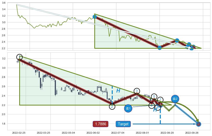 ➣ 【未确认突破,预测即将形成突破】下降三角形整理起点:2022-02-18, 预测突破点:2022-08-12,形态共115交易日