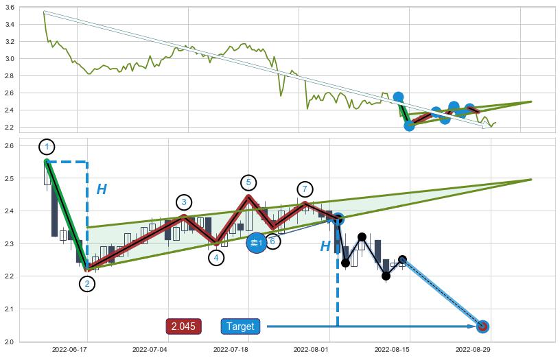 ➢ 【卖1】: 激进型 卖点→(2022-08-02: 2.375 )形成突破升🚩楔型【整理】形态