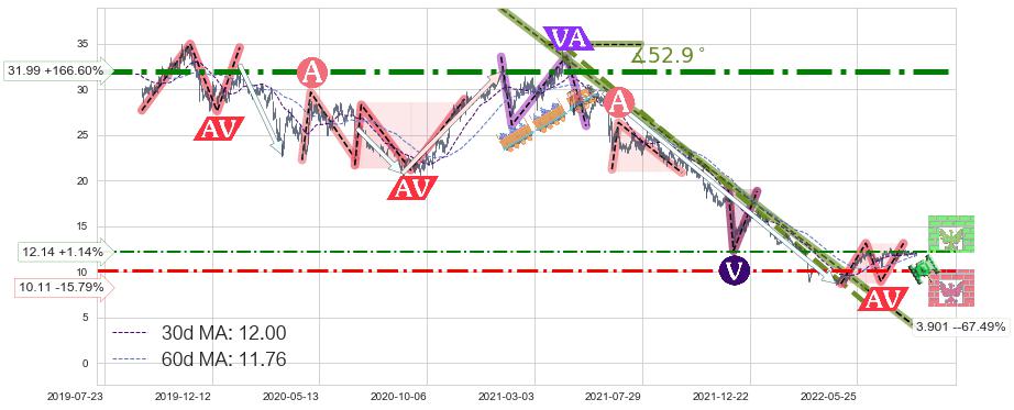 ♘ 阻力价格位12.14,可信任强度46.30%,距离最后交易2022-08-12形成的收盘价格12.00相差 +1.14%