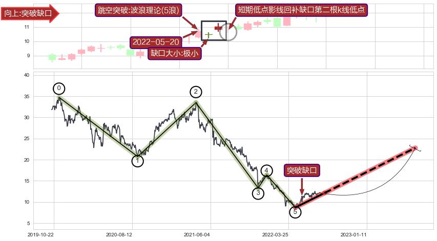 ➣ 突破缺口形成后,后续k已经超过14根,跳空突破波浪理论(5浪)关键点后, 出现【轻微回踩】迹象,短期低点影线回补缺口第二根k线低点