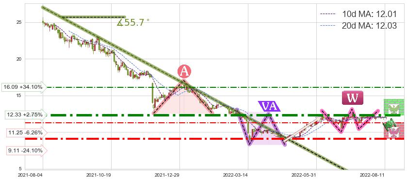 ♘ 阻力价格位16.09,可信任强度47.64%,距离最后交易2022-08-12形成的收盘价格12.00相差 +34.10%