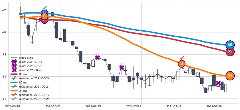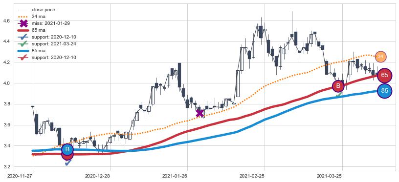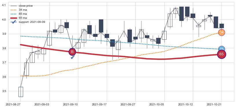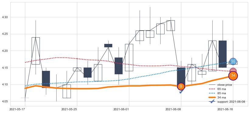⚀ 中期均线MA21上穿长期均线MA34形成的交叉是标准 黄金交叉
