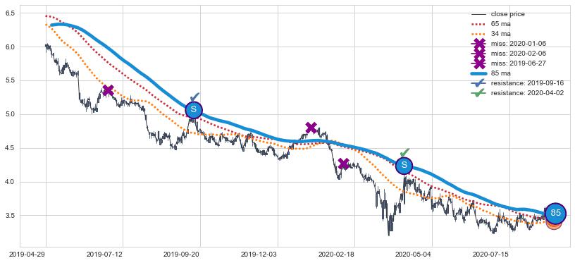 ⚄ 价格在均线遇到阻力后再次向下回落了【极短】距离, 第⑦卖出点 阻力效果【等待验证】