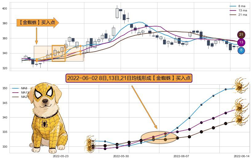 形态多维评估: ⚀ 2022-06-02日显现 8日-13日-21日均线 【金蜘蛛】买入点 看多信号,后市看涨,买入