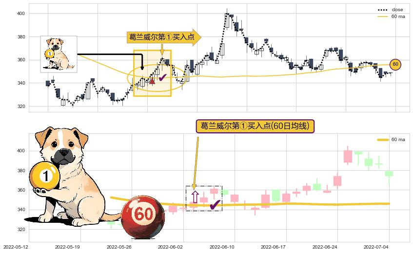 形态多维评估: ⚀ 2022-06-06-日显现 葛兰威尔均线 60日均线 第买①入点 走势反转见底信号,后市看涨,买进信号