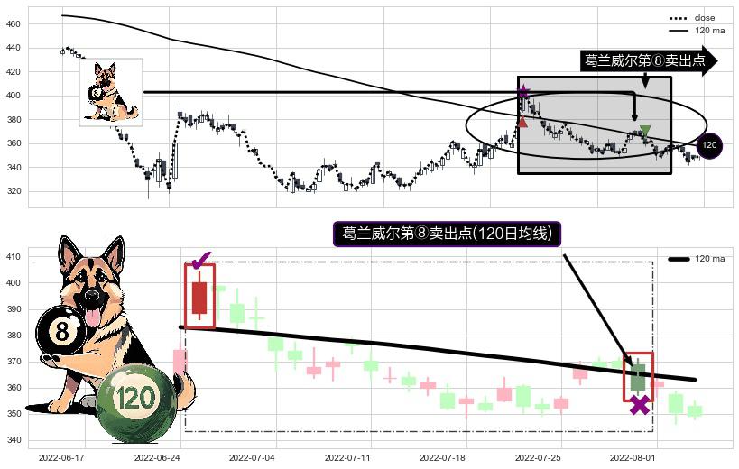 形态多维评估: ⚀ 2022-07-29-日显现 葛兰威尔均线 120日均线 第⑧卖出点 下降趋势的中继信号,后市看跌,卖出信号
