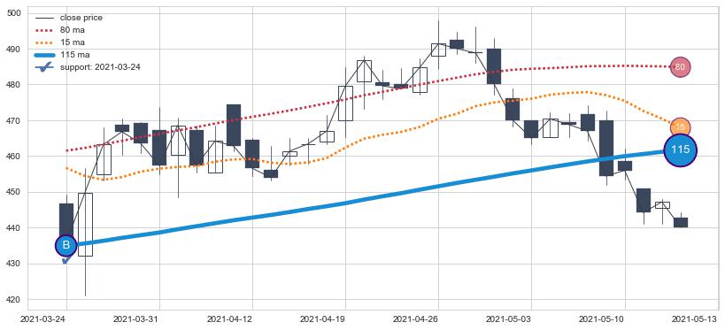 上涨趋势2021-03-12-2021-05-13,均线115确认关键支撑1处