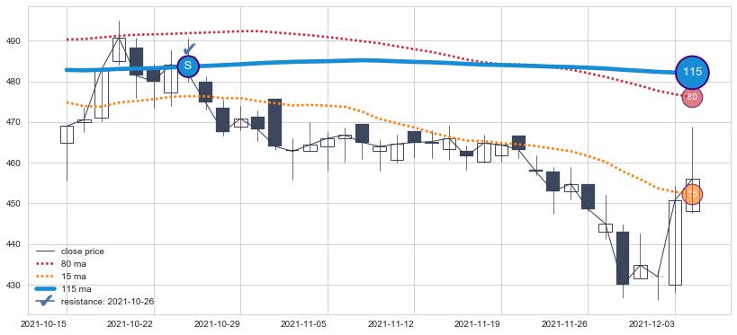 下跌趋势2021-10-15-2021-12-06,均线115确认关键阻力1处