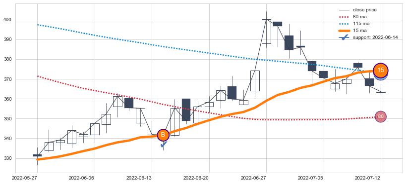 上涨趋势2022-05-27-2022-07-12,均线15确认关键支撑1处