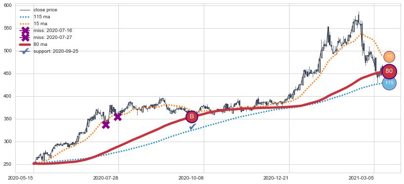 上涨趋势2020-05-15-2021-03-12,均线80确认关键支撑1处