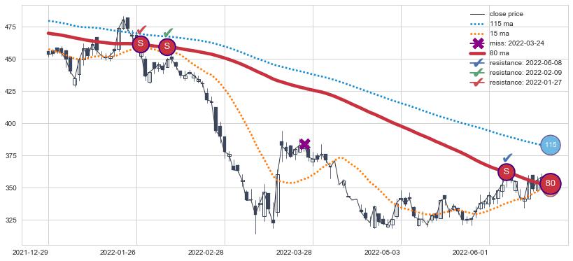 下跌趋势2021-12-29-2022-06-20,均线80确认关键阻力3处