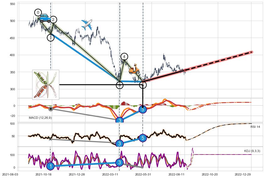 ➢ 1,3,5驱动浪MACD, RSI, KDJ走势都出现【常规背离】反转信号增强