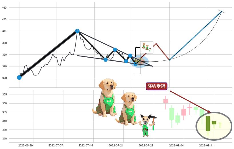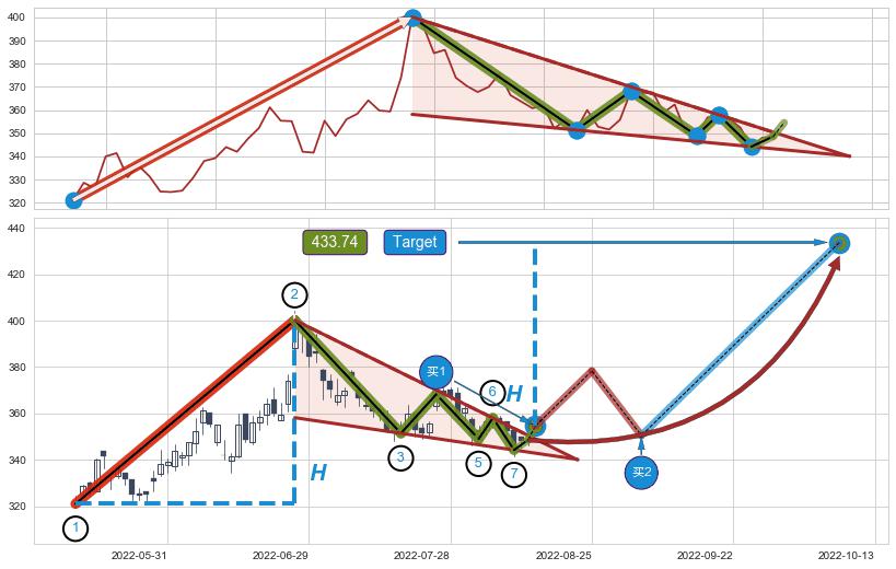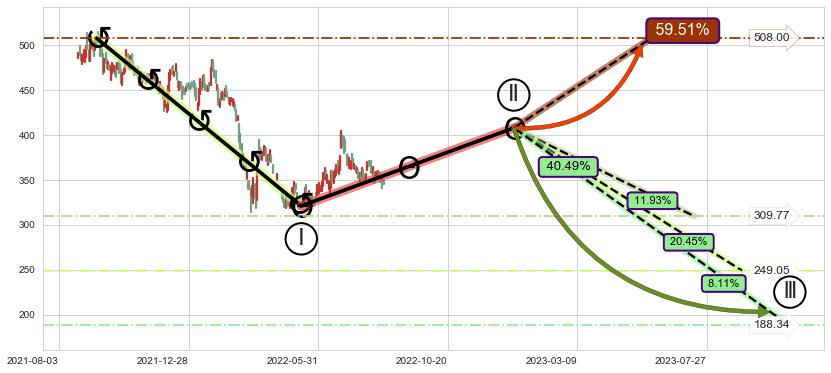 ➣ D点拟合预测价格427.20,距离最后交易收盘价格348.60相差 +22.55%