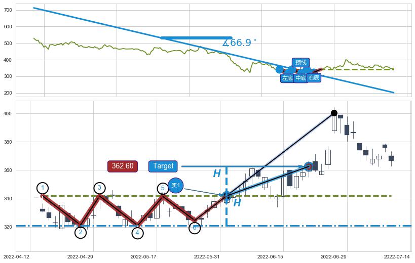 ➢ 【买1】: 激进型 买点 →(2022-06-01: 341.80 )形成突破三重底【反转】形态