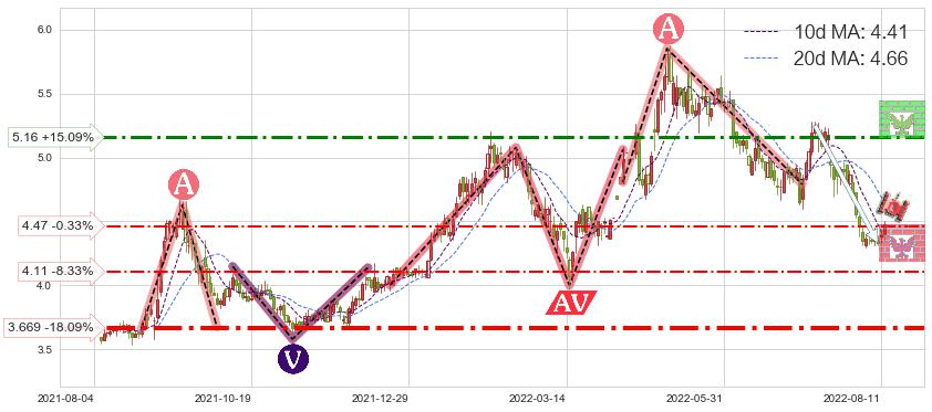 ♘ 支撑价格位4.11,可信任强度54.17%,距离最后交易2022-08-12形成的收盘价格4.48相差 -8.33%