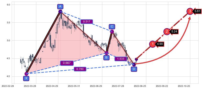 ➣ 未完成【蝴蝶】形态起点X: 2022-03-31, 已到达C点: 2022-07-13, 预测最终D点: 2022-11-17, 共156交易日