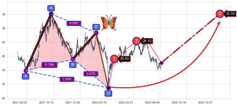 ➣ 已完成【蝴蝶】形态起点X: 2021-07-28, 终点D: 2022-03-15, 共157交易日