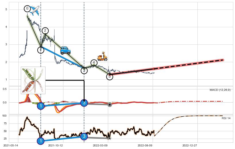 ➣ 第一, 三, 五浪下跌动能逐渐【衰弱变小】,趋势呈现不稳迹象