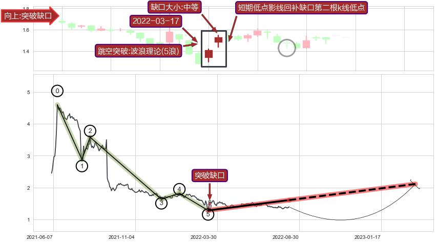 ➣ 突破缺口形成后,后续k已经超过14根,跳空突破波浪理论(5浪)关键点后, 出现【轻微回踩】迹象,短期低点影线回补缺口第二根k线低点