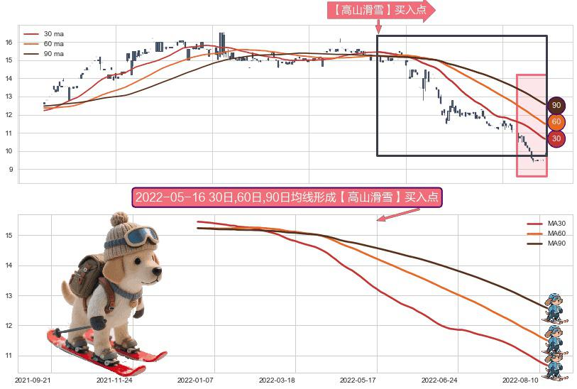 ⚀ 2021-12-30日-2022-08-12日显现 30日-60日-90日均线 【高山滑雪】买入点 看多信号,后市看涨,买入