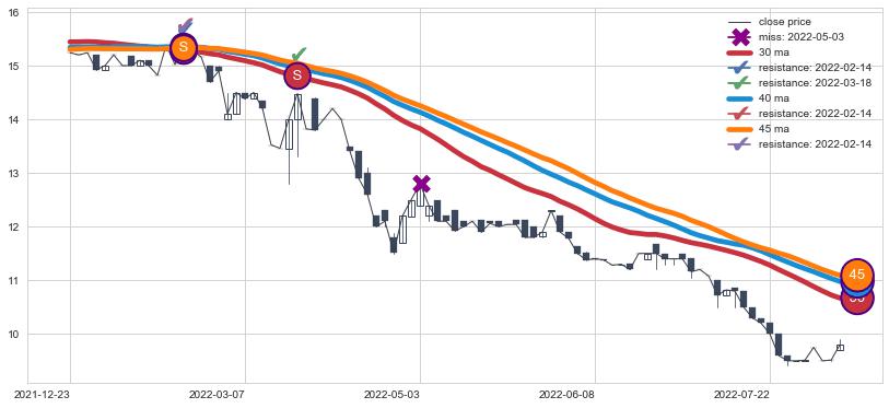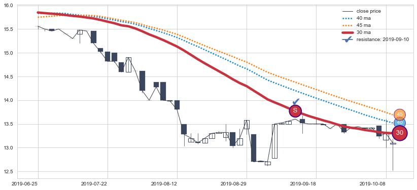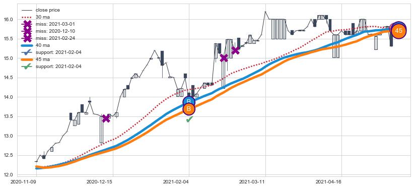 ➢ 最优均线组合共正确确认支撑阻力信号4处,正确确认率 50.00%