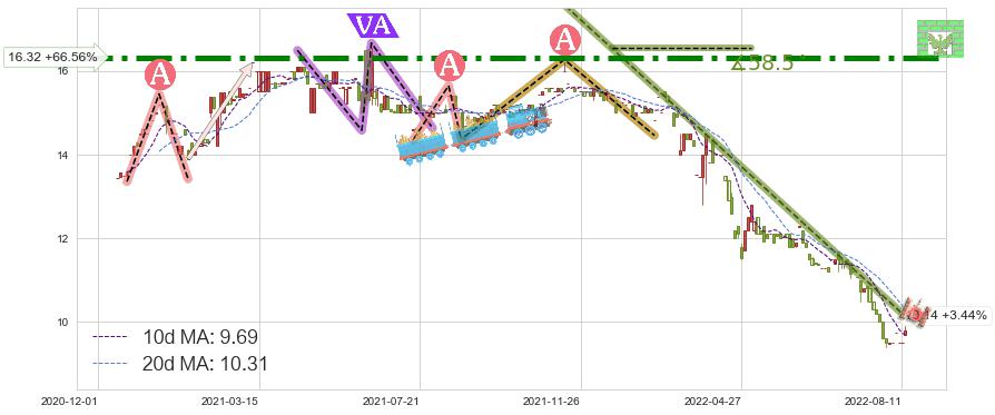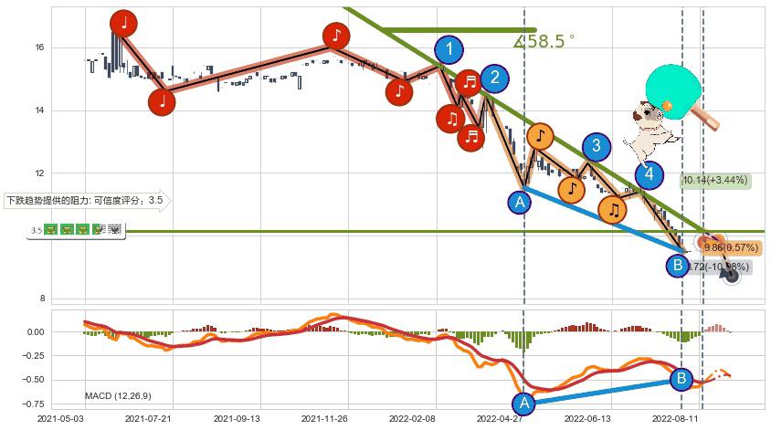 🦴 长线均值回复组合短线趋势跟踪[强阻力信号]2021-06-01-2022-08-12下跌趋势依然成立(下跌趋势跟踪依然存在),短线价格略微上行反弹(均值回复猜想),即将接近下跌趋势提供的未破位阻力价格:10.14。