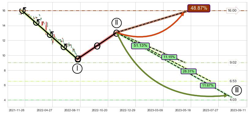 ➢ 循环浪继续向下【最高】位置(2023-05-04, 9.02),匹配聚类样本比例21.81%, 可能性概率11.15%
