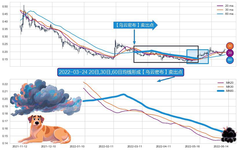 ⚀ 2022-01-07日-2022-06-10日显现 20日-30日-60日均线 【乌云密布】卖出点 看空信号,后市看跌,卖出