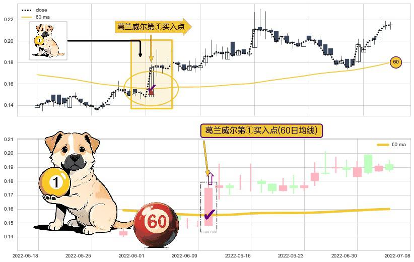 ⚀ 2022-06-10-日显现 葛兰威尔均线 60日均线 第买①入点 走势反转见底信号,后市看涨,买进信号