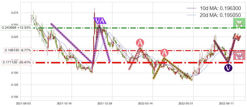 ♘ 支撑价格位0.196140,可信任强度66.67%,距离最后交易2022-08-12形成的收盘价格0.215000相差 -8.77%