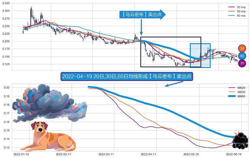 ⚀ 2022-02-23日-2022-06-10日显现 20日-30日-60日均线 【乌云密布】卖出点 看空信号,后市看跌,卖出