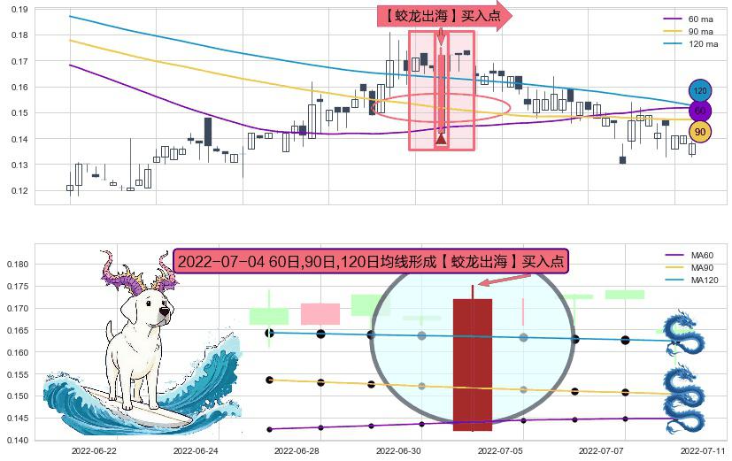 ⚀ 2022-07-04日显现 60日-90日-120日均线 【蛟龙出海】买入点 看多信号,后市看涨,买入