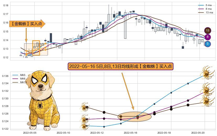 ⚀ 2022-05-16日显现 5日-8日-13日均线 【金蜘蛛】买入点 看多信号,后市看涨,买入