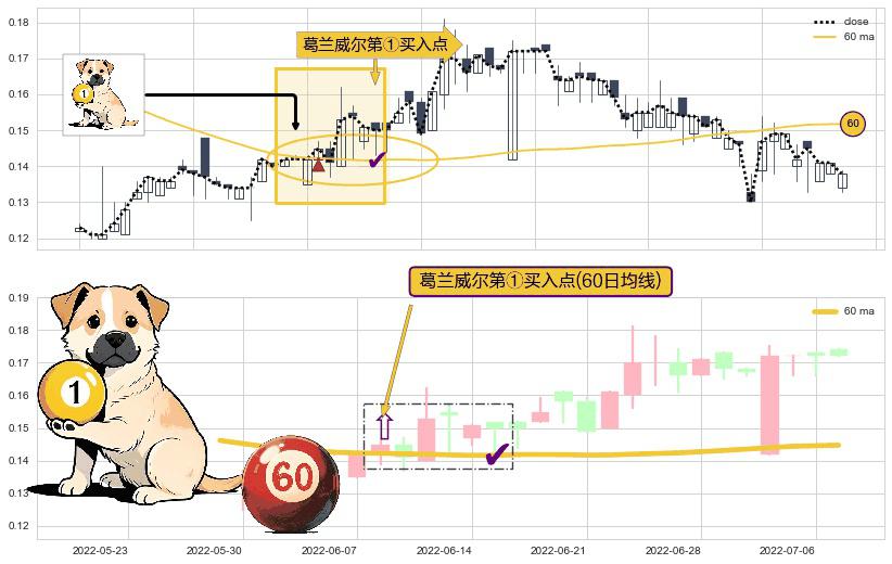 ⚀ 2022-06-08-日显现 葛兰威尔均线 60日均线 第买①入点 走势反转见底信号,后市看涨,买进信号