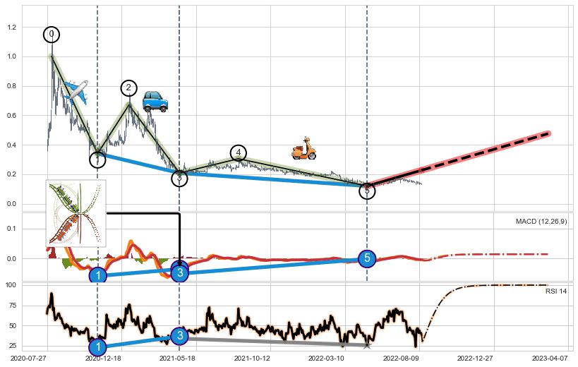 ➣ 第一, 三, 五浪下跌动能逐渐【衰弱变小】,趋势呈现不稳迹象