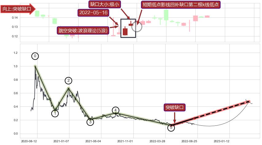 ➣ 突破缺口形成后,后续k已经超过14根,跳空突破波浪理论(5浪)关键点后, 出现【轻微回踩】迹象,短期低点影线回补缺口第二根k线低点