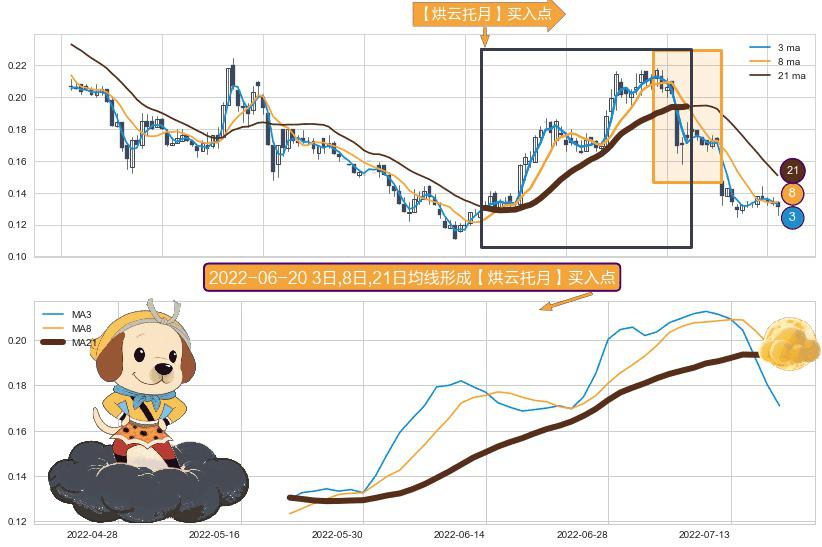 形态多维评估: ⚀ 2022-05-20日-2022-07-19日显现 3日-8日-21日均线 【烘云托月】买入点 看多信号,后市看涨,买入