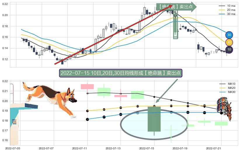 形态多维评估: ⚀ 2022-07-15日显现 10日-20日-30日均线 【绝命跳】卖出点 看空信号,后市看跌,卖出