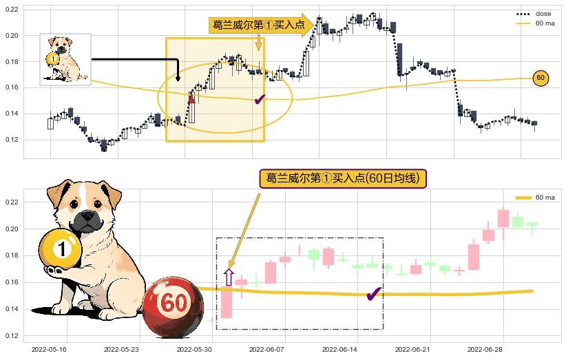 形态多维评估: ⚀ 2022-05-31-日显现 葛兰威尔均线 60日均线 第买①入点 走势反转见底信号,后市看涨,买进信号