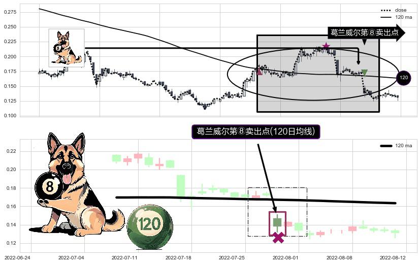 形态多维评估: ⚀ 2022-07-28-日显现 葛兰威尔均线 120日均线 第⑧卖出点 下降趋势的中继信号,后市看跌,卖出信号