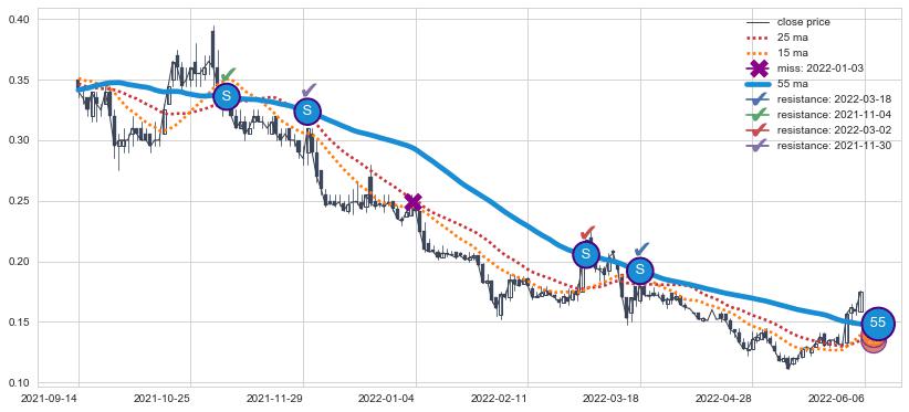 下跌趋势2021-09-14-2022-06-06,均线55确认关键阻力4处