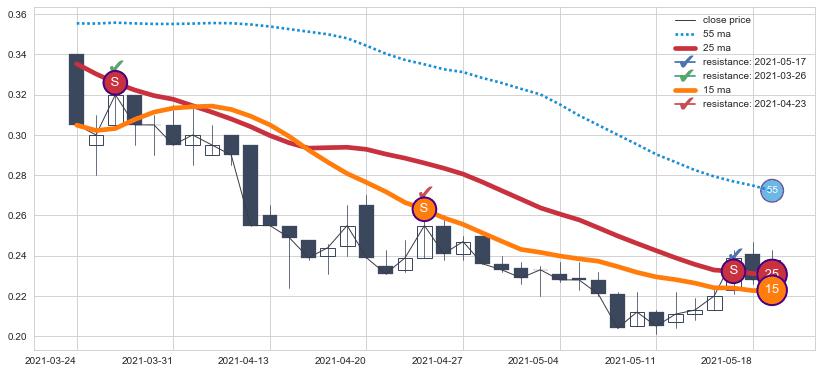 下跌趋势2021-03-16-2021-05-20,均线25, 15确认关键阻力3处