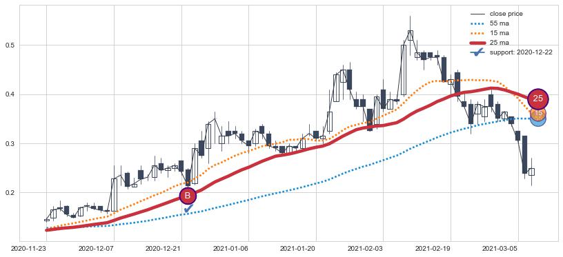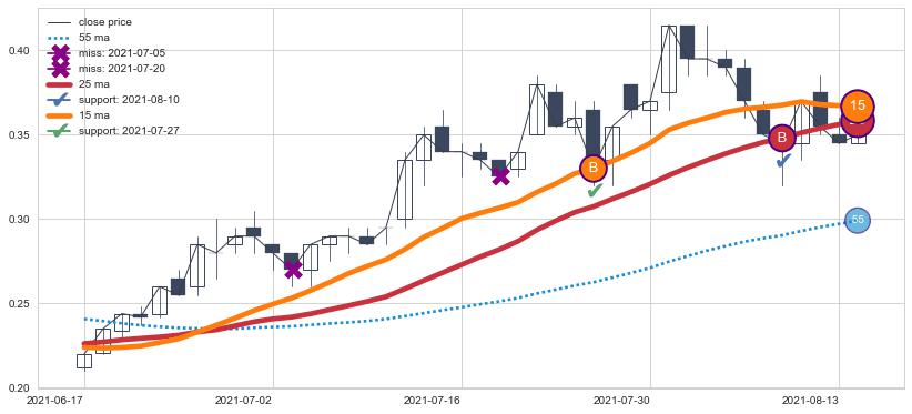 上涨趋势2021-06-17-2021-08-16,均线25, 15确认关键支撑2处